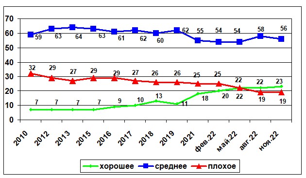 В 2022 году большинство россиян отмечают ухудшение в таких сферах как: отношения со странами Запада и НАТО (82%), общий уровень жизни (49%), работа медицинский учреждений (40%), возможность хорошо зарабатывать (39%). В таких областях, как влияние простых людей на государственные дела, возможность свободно высказывать свое мнение, личная безопасность, справедливость в распределении благ, большинство россиян не увидели значимых изменений ( https://www.levada.ru/2022/12/26/strong-itogi-2022-goda-v-predstavlenii-rossiyan-strong/ ).
