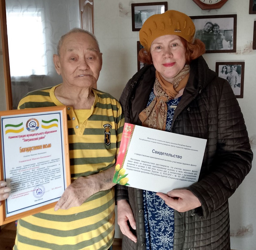 В юбилейный день отдел социальной защиты населения по Заиграевскому району, председатель Совета ветеранов п.Заиграево поздравили именинника с юбилеем, вручили поздравительные открытки от Президента РФ В.В. Путина от Главы РБ А.С. Цыденова, а также свидетельство о предоставлении единовременной выплаты.