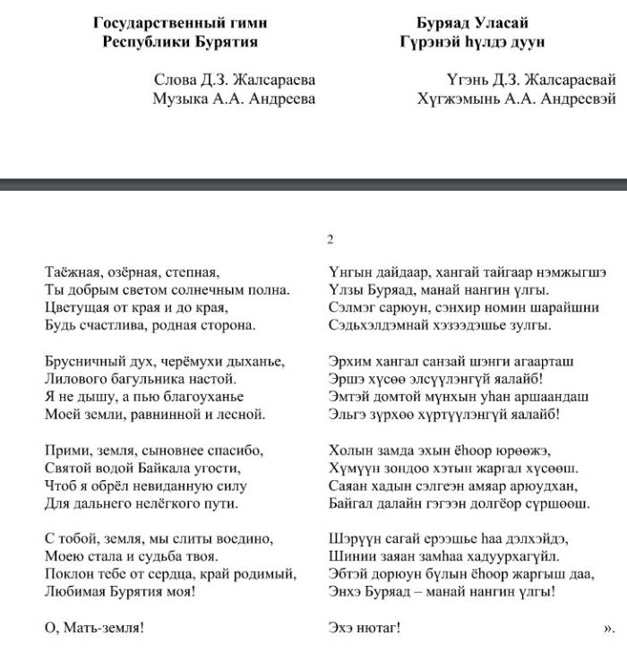 На очередной сессии 27 февраля депутаты Народного Хурала одобрили изменения в республиканский закон «О государственном гимне Бурятии». Некоторые термины в нём привели в соответствие с нормами современного бурятского литературного языка.