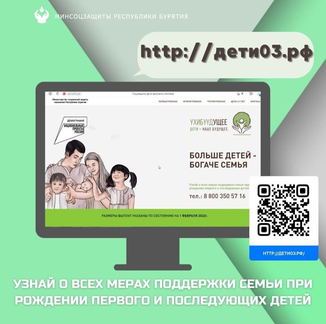 Министерство социальной защиты населения Республики Бурятия запустило сайт о мерах поддержки семьи при рождении первого и последующих детей: http://дети03.рф/ .