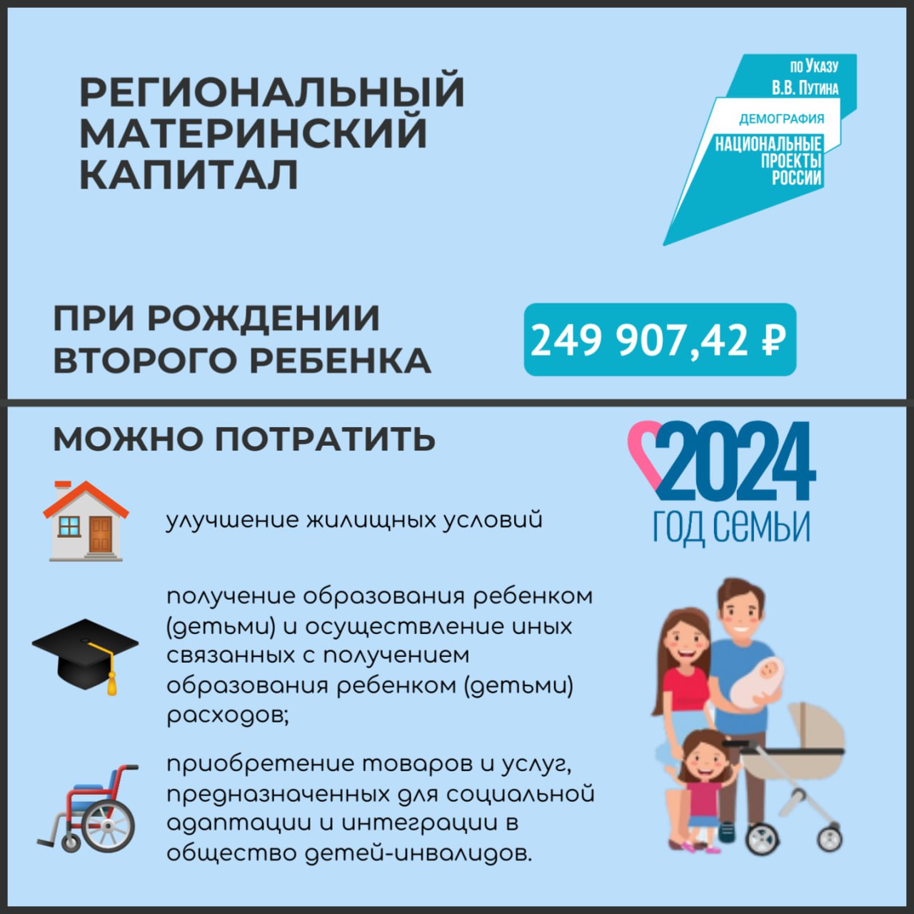 Напомним, региональный капитал в полном объеме либо по частям, кроме улучшения жилищных условий, можно направить на получение образования детьми, а также на приобретение товаров и услуг, предназначенных для социальной адаптации и интеграции в общество детей-инвалидов.