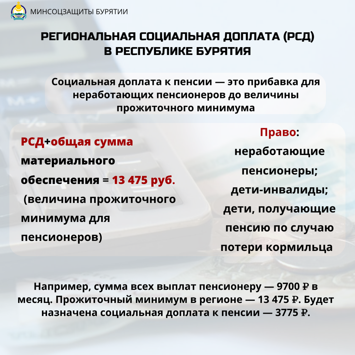 РСД устанавливается в таком размере, чтобы общая сумма материального обеспечения пенсионера с учетом данной доплаты достигла величины прожиточного минимума пенсионера, установленной в Республике Бурятия (с 01.01.2023 г. – 13475 руб.).