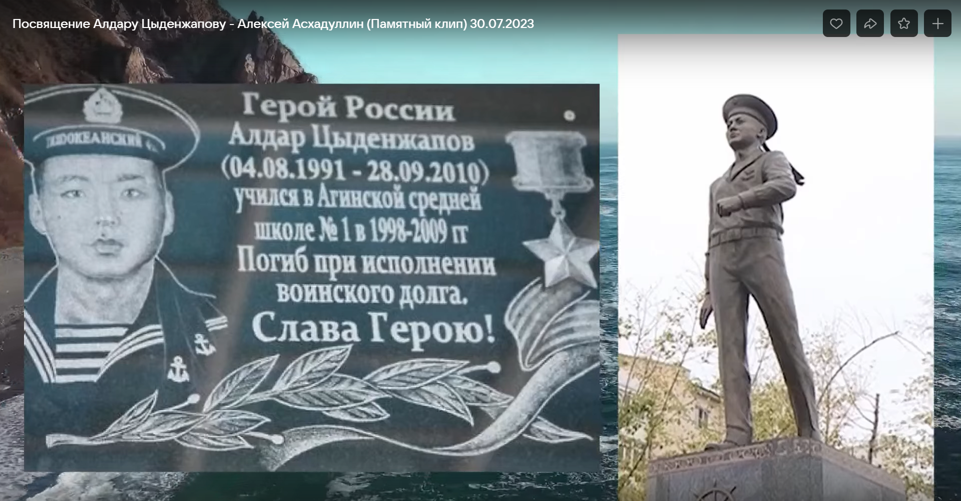 Алексей Асхадуллин на своё авторское песенное посвящение Герою России Алдару Цыденжапову подготовил памятный клип. Клип https://vk.com/video738858593_456239025 , размещённый 30 июля 2023 года, в день Военно- Морского Флота России, за одни сутки набрал уже порядка 10 000 просмотров.