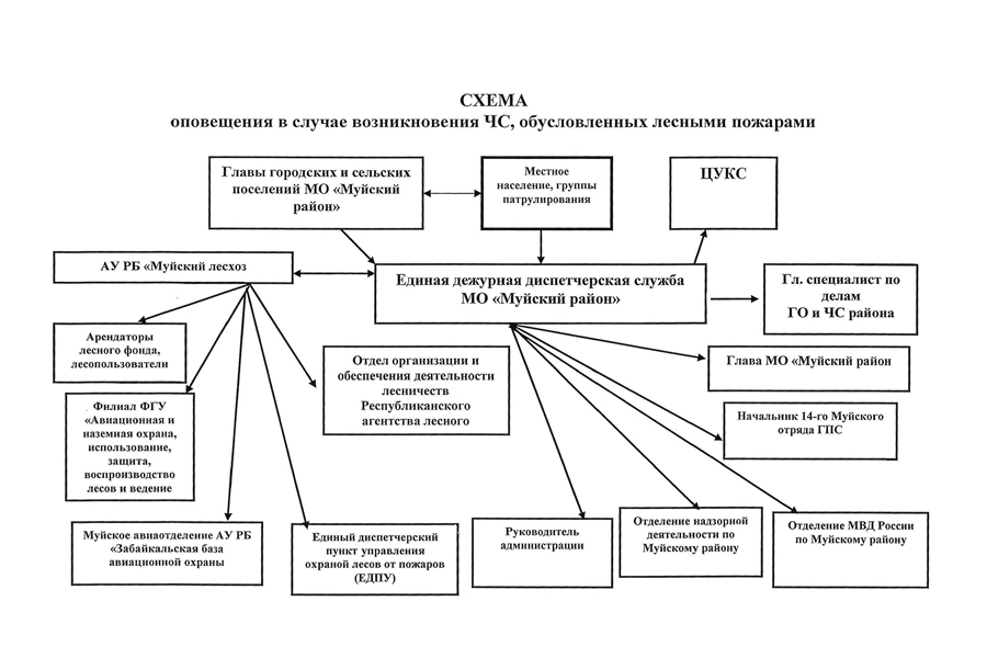 Запретить с начала пожароопасного сезона 2023 года и до его окончания выжигание сухой травянистой растительности, стерни, пожнивных остатков на землях сельскохозяйственного назначения, землях запаса, землях населенных пунктов, разведение костров на полях. Запретить в полосах отвода автомобильных дорог, полосах отвода и охранных зонах железных дорог, путепроводов и продуктопроводов выжигать сухую травянистую растительность, разводить костры, сжигать хворост, порубочные остатки и горючие материалы, а также оставлять сухостойные деревья и кустарники. В случае, если на территории муниципального образования не локализованы крупные пожары (площадью более 25 гектаров в зоне наземной охраны лесов и более 200 гектаров в зоне авиационной охраны лесов), или лесной пожар действует более 2-х суток, принимать своевременные меры по введению на территории муниципального образования режим чрезвычайной ситуации в лесах муниципального характера. Утвердить план мероприятий по подготовке к пожароопасному сезону в МО «Муйский район» на 2023 г., согласно приложению № 1 к настоящему постановлению. Утвердить схему оповещения в случае возникновения чрезвычайной ситуации, обусловленной лесными пожарами согласно приложению № 2 к настоящему постановлению. Рекомендовать Главе МО СП «Муйская сельская администрация» (Васяновичу В.П.)., Главе МО ГП «Северомуйское» (Аниной О-Г-С.Б):— совместно с АУ РБ «Муйский лесхоз» (Аксеновым А.Ю.) разработать и утвердить план мероприятий по предупреждению и ликвидации пожаров на подведомственных территориях;