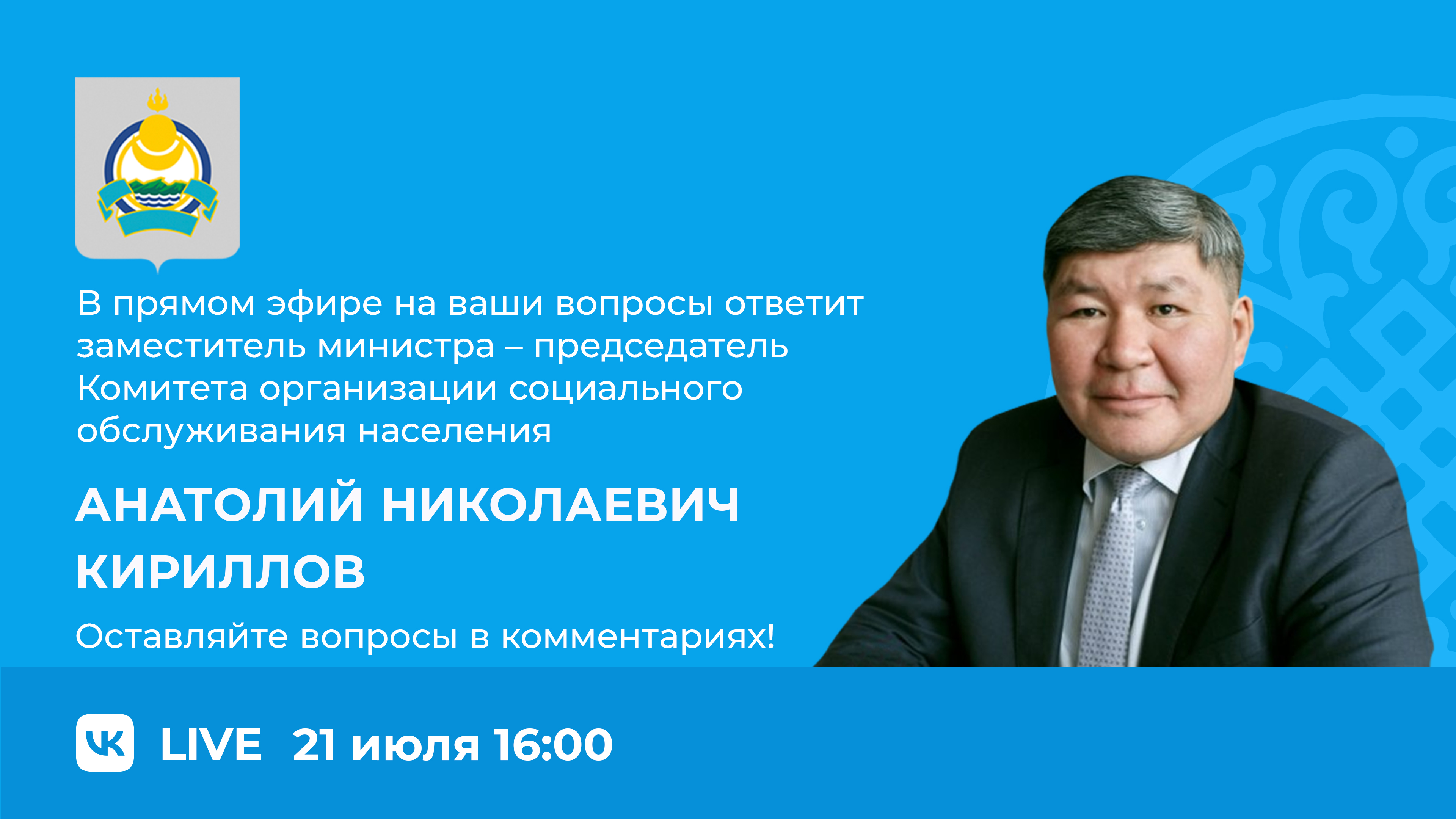 В эту пятницу, 21 июля, в 16:00 пройдет прямой эфир с Кирилловым Анатолием Николаевичем, заместителем министра – председателем Комитета по организации социального обслуживания населения Министерства социальной защиты Республики Бурятия.