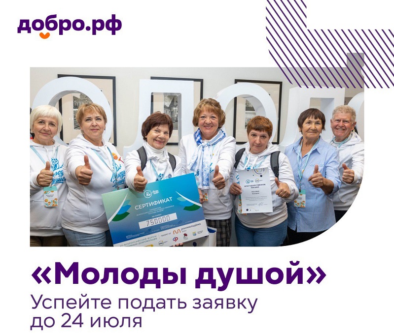 Стартовал Всероссийский грантовый конкурс по поддержке социальных проектов «Молоды душой» - 2024. Он направлен на поддержку социальных проектов граждан старшего возраста (50+) с целью развития наставничества и «серебряного» добровольчества.
