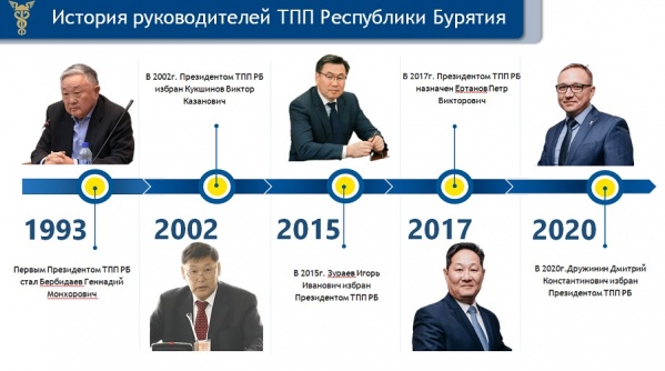 Первым президентом ТПП Бурятии был Геннадий Бербидаев, он же был и идейным вдохновителем объединения бизнеса республики. После него долгое время ТПП возглавлял Виктор Кукшинов – в период его руководства палата пережила вместе со всей страной непростое время 1990-х годов. В 2015 году палату возглавил Игорь Зураев, с которым пришло новое дыхание – именно с этого времени объединение начало активно развиваться, а клиентская база нарастать. Буквально за два года в ТПП пришло более 150 новых участников.