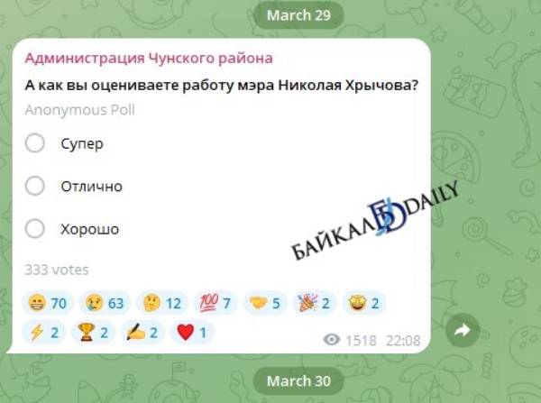 29 марта администрация Чунского района Иркутской области запустила в своём официальном Telegram-канале онлайн-опрос. Местных жителей попросили оценить работу мэра Николая Хрычова. Однако на выбор они предложили только три положительных ответа – «Супер», «Отлично» и «Хорошо». Нейтральных или негативных оценок опрос не предусматривал.