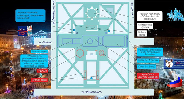 - Основная концепция оформления площади Ленина – триколор. Площадь визуально будет разделена на белый, синий и красный цвета. В центре новогодняя ель, детский каток со светодиодным шатром. Рядом будут каток для взрослых, большая горка в виде читинского острога, маленькая - в виде первых зимовий. Вокруг фонтана – 10 ледовых фигур. Скульптуры будут отображать летопись Забайкалья от Александра Невского, Бекетова, Муравьёва-Амурского и до наших дней, - пояснила Инна Щеглова.
