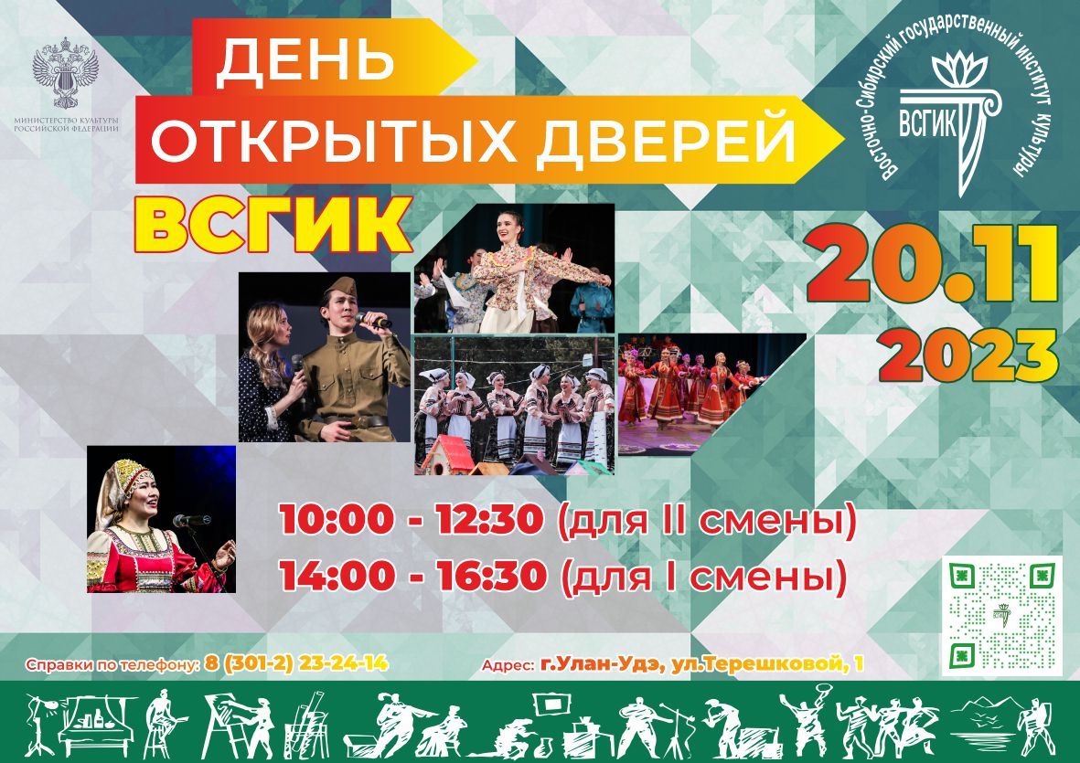 ФГБОУ ВО «Восточно-Сибирский государственный институт культуры» приглашает 20 ноября 2023 года, обучающихся 9-11 классов школ и студентов СПО на «День открытых дверей»