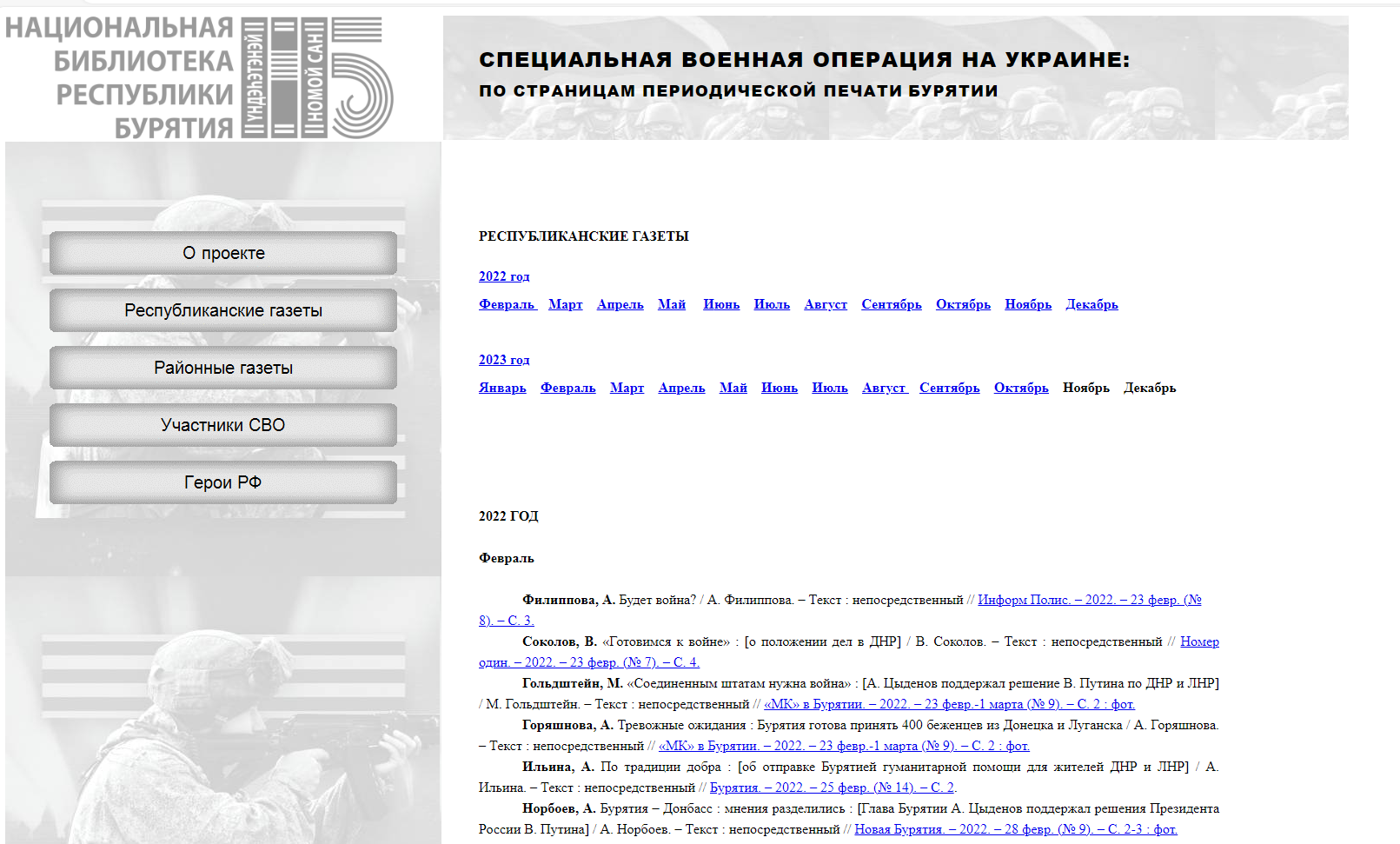 Ко Дню защитника Отечества Национальной библиотекой Бурятии обновлена полнотекстовая коллекция статей из республиканской и районной прессы, посвященных специальной военной операции на Украине и ее участникам. Добавлены статьи за 2023 год (частично) по разделам: