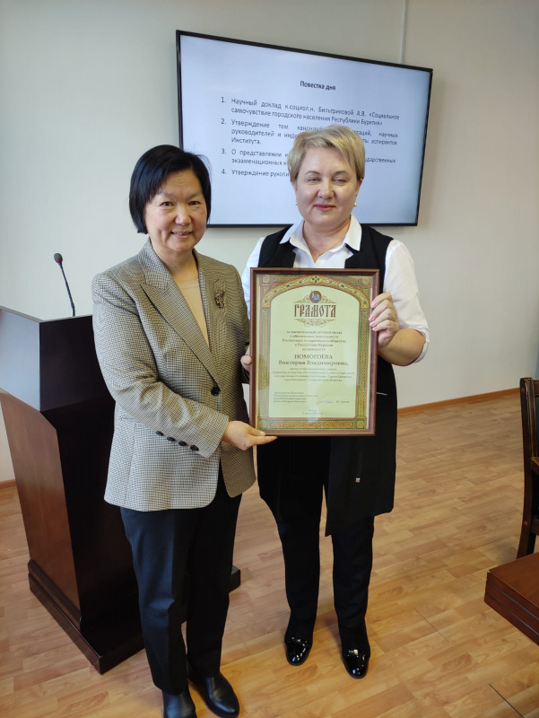 31 октября 2023 г. на заседании Учёного совета Института монголоведения, буддологии и тибетологии СО РАН торжественно была награждена Почётной грамотой Российского исторического общества доктор исторических наук, доцент, проректор по НИР БГУ Виктория Владимировна Номогоева.