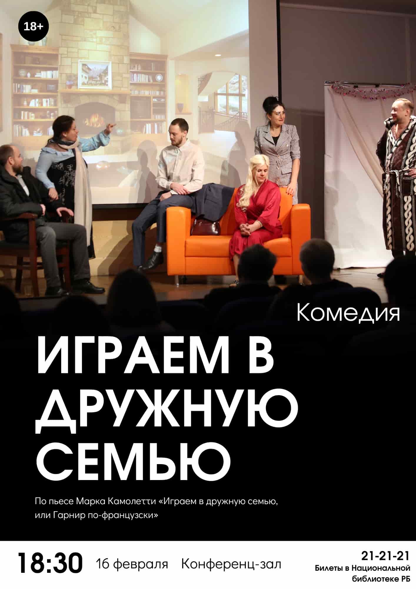 В конференц-зале Национальной библиотеки состоится показ спектакля «Играем в дружную семью» по знаменитой пьесе Марка Камолетти «Играем в дружную семью, или гарнир по-французски». Эта весёлая комедия положений о том, как трудности в семейных отношениях становятся поводом для абсолютно парадоксальных ситуаций, которые приведут к самому неожиданному финалу.