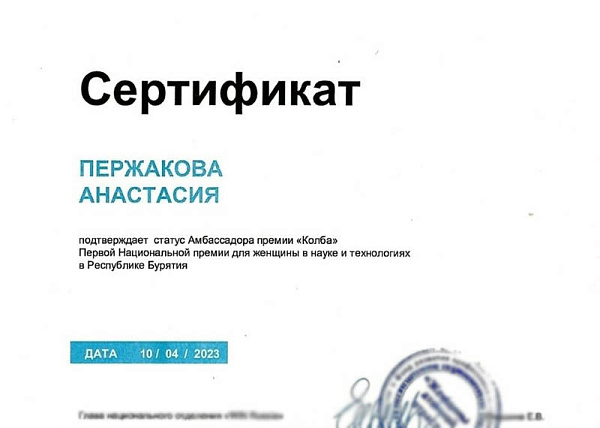 Анастасия Пержакова, учитель биологии школы №7 из Улан-Удэ, стала официальным амбассадором первой национальной премии «KOLBA» для женщин-учёных и специалистов из науки и технологий.
