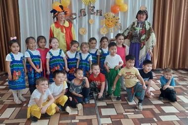 Создать атмосферу поистине народного гуляния помогли несложные аксессуары. Детей нарядили в яркие русские костюмы, от чего они пришли в неописуемый восторг. Программа развлечения получилась очень веселой.