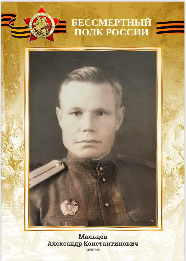 «Наш семейный Герой - Мальцев Александр Константинович, родной дед моей супруги. Родился в 1915 году, окончил Читинский железнодорожный техникум, получил две специальности: «ремонт вагонов» и «ремонт военной техники» и работал мастером в депо. Чтобы получить высшее образование поехал в Томск, где и застал начало войны. И уже оттуда попал на фронт и дошел до Западной Польши. Его фронтовой путь очень интересный. Часть - он рассказывал, часть - мы подняли из архивов, какую-то информацию нашли на сайте «Память народа». Это очень хороший ресурс, где есть маршруты воинских частей», - поделился глава.