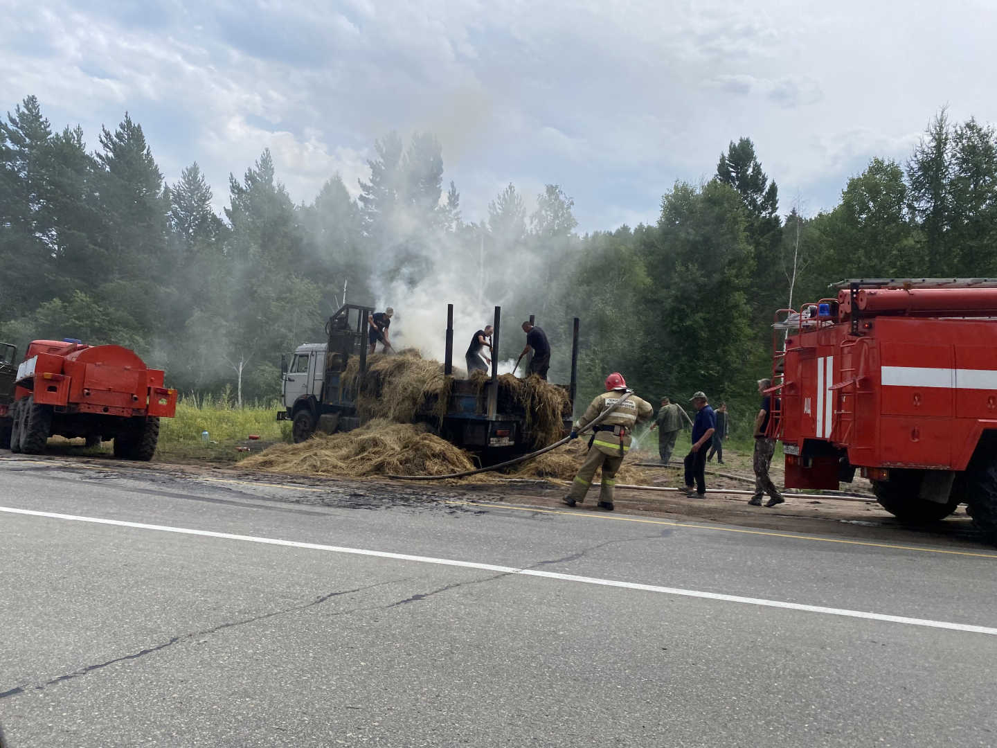 КАМАЗ, гружённый сеном, двигался на подъем, когда водитель увидел задымление в кузове. Как рассказали очевидцы событий, водитель экстренно остановился и попытался самостоятельно потушить пожар. Однако сбить пламя ему не удалось и он вызвал пожарных. К счастью, две пожарные машины были недалеко, они оперативно приехали и затушили возгорание.