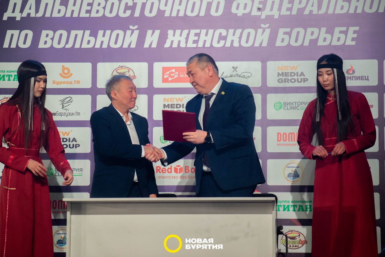 В первый день чемпионата ДФО по вольной и женской борьбе (6+) было подписано соглашение о взаимодействии между Федерацией и ЗГРП на 2023-2024 гг. В нем приняли участие президент Федерации Чимит Бальжинимаев и заместитель гендиректора ЗГРП Петр Архинчеев.