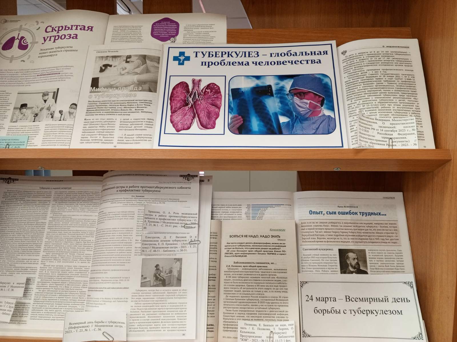 В журнале «Медицинская сестра» № 1 за 2023 год очень много статей по актуальной теме : Данилов Г. «Туберкулёз в мировой литературе», Храмкова, О. А. «Роль медицинской сестры в работе противотуберкулёзного кабинета и профилактике туберкулёза», Брудян Г. С. «Туберкулёз в стоматологической практике», Елистратов Д. Г. «Витамин D в комплексном лечении туберкулёза» и др.