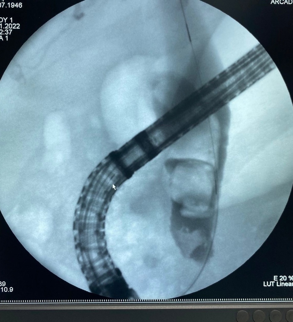 Так, 2 ноября была проведена эндоскопическая операция, во время которой были извлечены 3 желчных камня диаметром 8 мм, 12 мм, 16 мм. Но, к сожалению, в просвете желчных путей остался желчный камень диаметром 22мм, который невозможно было извлечь, не повредив стенку желчного протока. Решением консилиума врачей в составе оперирующего врача - эндоскописта, лечащего врача хирурга, врача анестезиолога и уролога было решено провести попытку лазерного разрушения крупного камня ОЖП (лазерной литотрипсии). Данный метод применяется в крупнейших хирургических клиниках России.