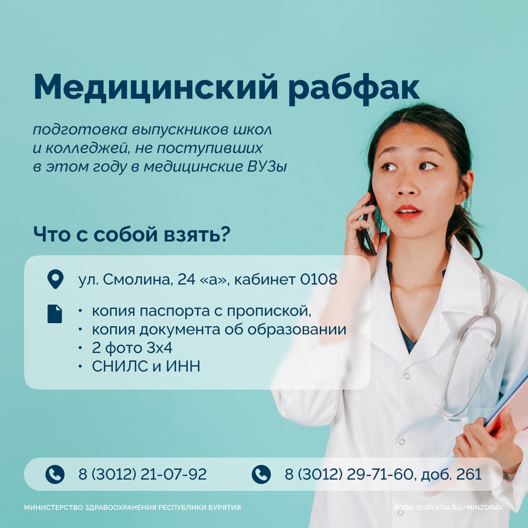 Минздрав Бурятии совместно с БГУ имени Доржи Банзарова при поддержке Главы республики Алексея Цыденова объявляет набор на Медицинский рабфак.