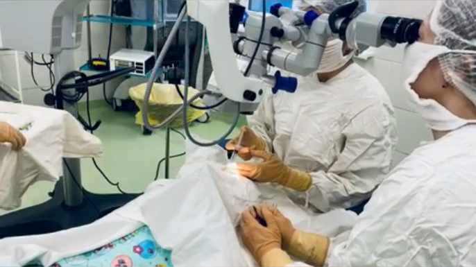 «Девочку, родившуюся весом всего 460 грамм на 24 неделе беременности, перевели из роддома в ДРКБ перед самым Новым 2023 годом. Хотя малышка и набрала вес 1600 грамм, но еще не могла дышать самостоятельно, была на аппарате искусственной вентиляции легких. Срочный перевод потребовала агрессивная форма ретинопатии недоношенных. Чтобы предотвратить слепоту у младенца, врачам давалось не более 3 суток для принятия мер. Ранее проведенная лазер-коагуляция не остановила патологический рост сосудов сетчатки, и единственной надеждой на спасение способности видеть стало применение нового метода – интравитреального введения Луцентиса путём введения лекарственного препарата в стекловидное тело глаза», - рассказали в ДРКБ.