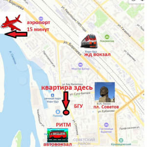 До автовокзала 5 минут пешком, 10-15 минут до ЖД вокзала, 15-20 минут на транспорте до аэропорта "Байкал".