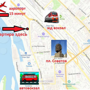 До автовокзала 5 минут пешком, 10-15 минут до ЖД вокзала, 15-20 минут на транспорте до аэропорта "Байкал".